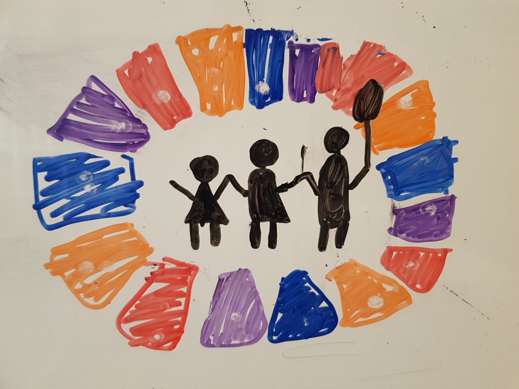 Asamblea: Die Kinder waren kreativ und haben dieses schöne Bild gemalt, das zeigt, wofür die Schulgemeinschaft steht: Kinderrechte und nachhaltige Entwicklung sowie Vielfalt/Diversity und Inklusion